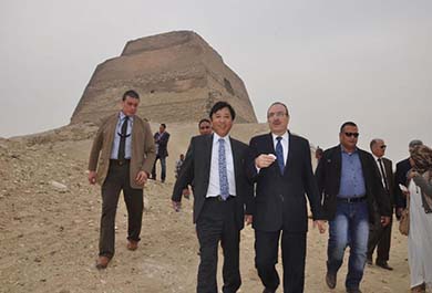 وتفقد المحافظ والسفير الياباني هرم ميدوم والتعرف على قيمته التاريخية والأثرية الكبيرة والذي يعتبر ثاني أقدم هرم مدرج في العالم وبناه الأمير "حونى " واستكمله "سنفرو "ويرجع للأسرة الرابعة وكان مكوناً من 7 درجات لم يتبق منها سوى 4 درجات ، حيث تفقدا المعابد الجنائزية والمقابر التى تحيط بالهرم، والخاصة بأمراء الدولة فى هذا العصر
