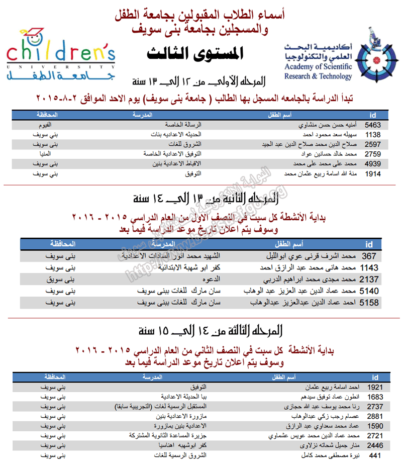 http://www.benisuef.gov.eg/Project/BNSNewsDetails.aspx?id= | Yes | | 13668 | جامعة بني سويف تحتفل بتخريج دفعة ثانية من كلية الحاسبات والمعلومات | 23/08/2017 | الوطن |